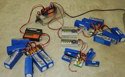 (photo below: parallel charging in progress--6 2S LiFe batteries plugged into a parallel charge board)