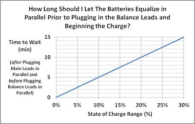 Also, after plugging in all main battery leads in parallel to each other, it is best to let the batteries’ voltage equalize for a few minutes before plugging in the balance leads in parallel and beginning the charge. The chart below is just a rough estimate of how much time is recommended to let the batteries equalize their voltages prior to plugging in their balance leads and starting the charger. Note: State of charge range = most charged battery State of Charge – least charged battery state of charge. Ex: If the most full battery is at 50% and the least full battery is at 30%, the state of charge range is 50% - 30% = 20%.